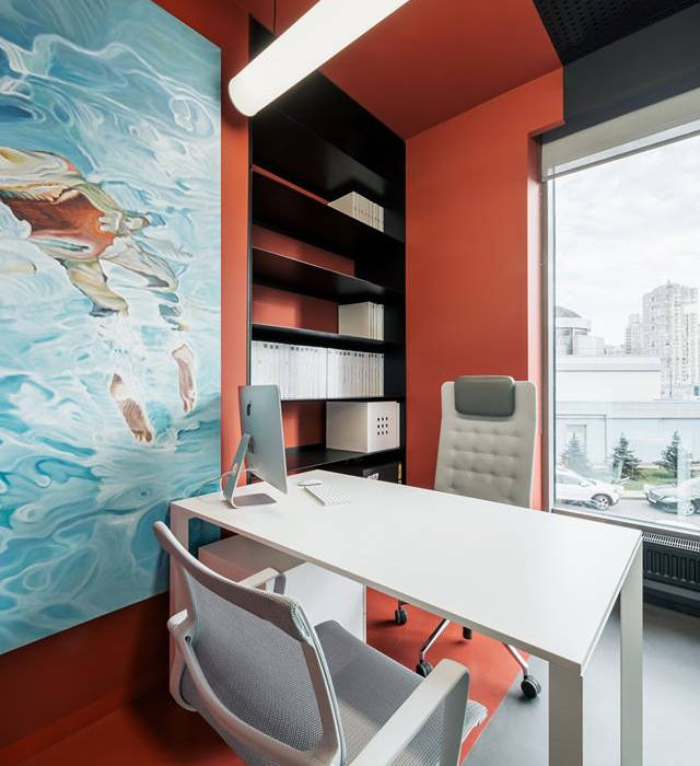 Das erste vollständige Büro für die Schweizer Kochgeschirrmarke Vinzer, entwickelt in Kiew, Ukraine. Die beeindruckende Arbeit der Architekten in Zusammenarbeit mit dem Investor hat eine flexible Umgebung geschaffen, die den Charakter der Marke verkörpert. Inspiriert von der industriellen Natur des Gebäudes präsentiert dieses zu 100 % maßgeschneiderte Büro ein Zusammenspiel dunkler und roter Elemente, das die Qualität der luxuriösen Materialien hervorhebt, die in Vinzers Haushaltsprodukten verwendet werden. Schwarz, Grau und Rot dominieren die Farbpalette, wobei große Blöcke kontrastierender Farben die Aufmerksamkeit der Besucher auf sich ziehen.