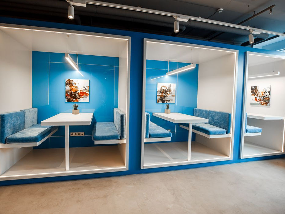 The complete co-working space featuring stylish neon elements and bright colors, established in just two months. The impressive work of the architects, in collaboration with the investor, has created a vibrant and dynamic environment. This 100% custom-made co-working space incorporates neon accents and bold color schemes, setting a new standard for shared work environments and drawing attention with its striking visual appeal.